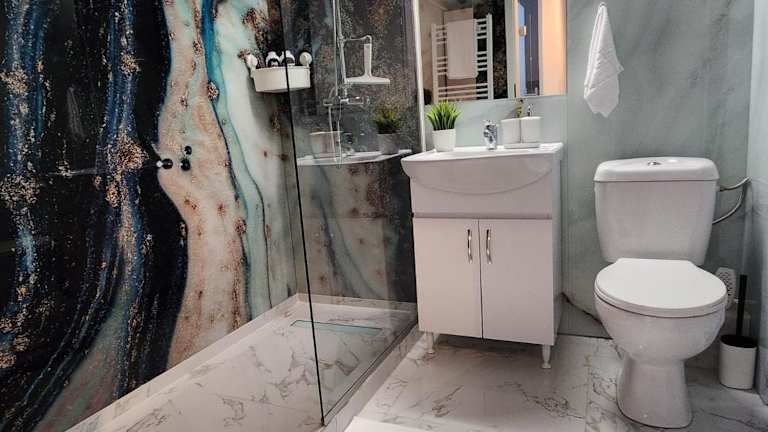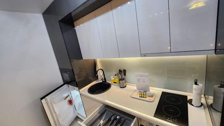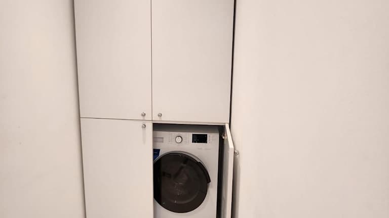 Die Ferienwohnung bietet ein Schlafzimmer, eine Küche mit Kühlschrank und Ofen sowie ein Badezimmer mit Dusche und kostenlosen Pflegeprodukten. Eine Waschmaschine ist ebenfalls vorhanden, und Handtücher sowie Bettwäsche werden bereitgestellt.