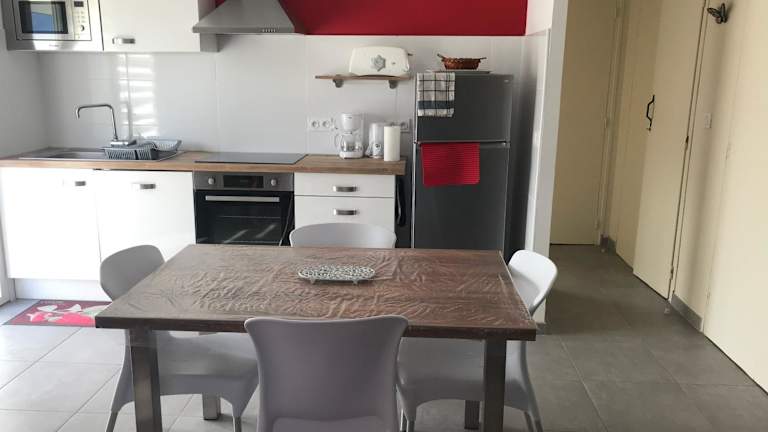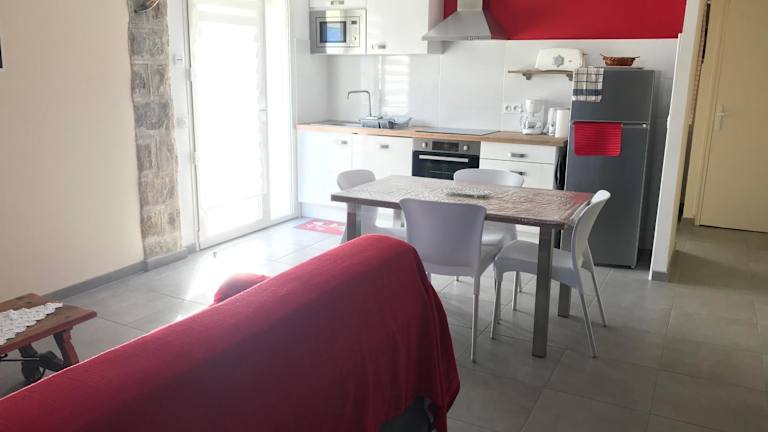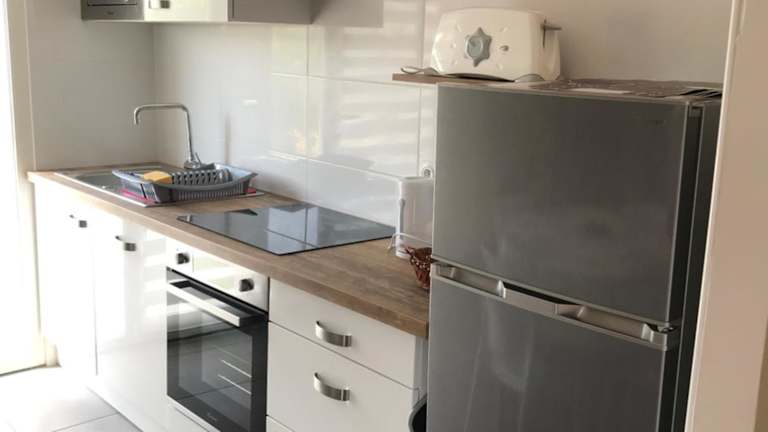 Die gut ausgestattete Küche der Ferienwohnung beinhaltet einen Kühlschrank, einen Geschirrspüler und einen Ofen, sodass Gäste die Möglichkeit haben, ihre eigenen Mahlzeiten zuzubereiten.