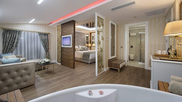 Die Elysium Green Suites in Antalya bieten eine komfortable Unterkunft mit vielen Annehmlichkeiten. Das Hotel verfügt über einen saisonalen Außenpool, ein Fitnesscenter und ein Restaurant. Die Zimmer sind modern eingerichtet und mit allen notwendigen Annehmlichkeiten ausgestattet. Die Unterkunft bietet auch einen eigenen Strandbereich, eine Bar und eine Sauna. Das freundliche Personal steht Ihnen rund um die Uhr zur Verfügung.