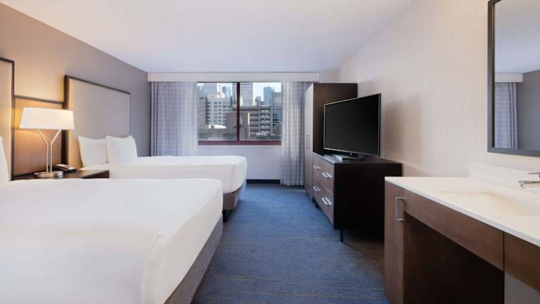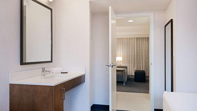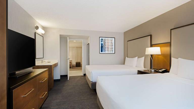 Die Suiten im Embassy Suites Chicago - Downtown River North sind modern und komfortabel eingerichtet. Jede Suite verfügt über ein privates Schlafzimmer und ein geräumiges Wohnzimmer, in dem sich 2 Flachbildfernseher befinden. Die Suiten sind in warmen Farben gestaltet und mit dunklen Holzmöbeln ausgestattet. Zur weiteren Ausstattung gehören ein kleiner Kühlschrank, eine Mikrowelle und eine iPod-Dockingstation.