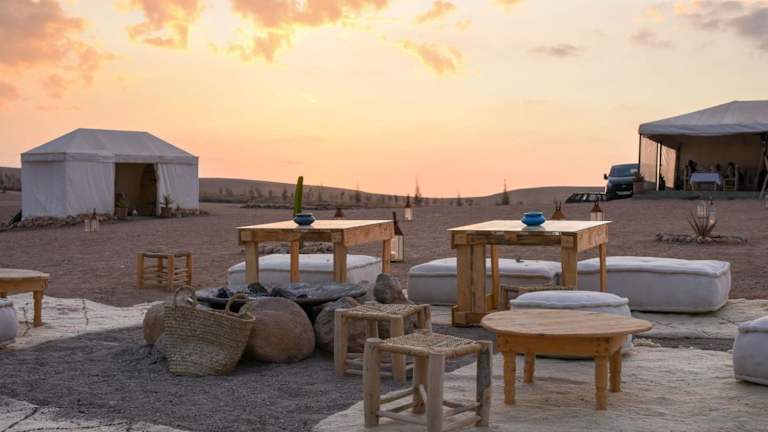 Verbringen Sie einen luxuriösen Aufenthalt im Emeraude Camp Agafay in Agafay. Dieses einzigartige Zeltcamp bietet einen atemberaubenden Bergblick, einen schönen Garten und eine Terrasse. Genießen Sie den Komfort kostenfreien WLANs und Privatparkplätzen. Beginnen Sie Ihren Tag mit einem köstlichen kontinentalen Frühstück und erkunden Sie die nahegelegenen Sehenswürdigkeiten wie die Menara-Gärten und den Platz Djemaa el Fna. Der Flughafen Marrakesch-Menara ist nur 33 km entfernt und ein kostenpflichtiger Flughafentransfer wird angeboten.