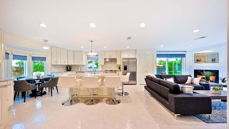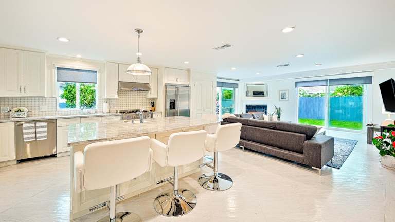 Die Zimmer umfassen eine Küche mit Kühlschrank und Geschirrspüler, drei Schlafzimmer sowie zwei Badezimmer mit Dusche, Haartrockner und Waschmaschine.