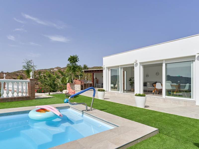 Entre montañas ist ein Ferienhaus mit klimatisierten Übernachtungsmöglichkeiten, eigenem Pool, Veranda und Terrasse mit Stadtblick.
