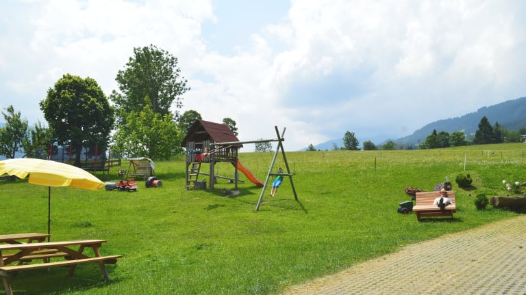 Ein großer Spielplatz lässt Kinderherzen höher schlagen, unsere eigenen Kinder freuen sich immer auf Spielkameraden. Spielsachen, Kinderfahrzeuge und Trettraktoren, ein „Riesentrampolin“ sowie jede Menge weitere Möglichkeiten lassen keine Langeweile aufkommen. Auch im Stall bei den Tieren gibt es viel zu entdecken. Nebenbei haben die Eltern Zeit zum Entspannen und vielleicht auch die Ruhe, endlich einmal ein Buch zu lesen. Im Sommer begleiten wir Sie auf die Holzalm, dem Urlaubsplatz unserer Kühe. Wir erklären Ihnen bei einer Führung, wie Butter und Käse hergestellt wird.