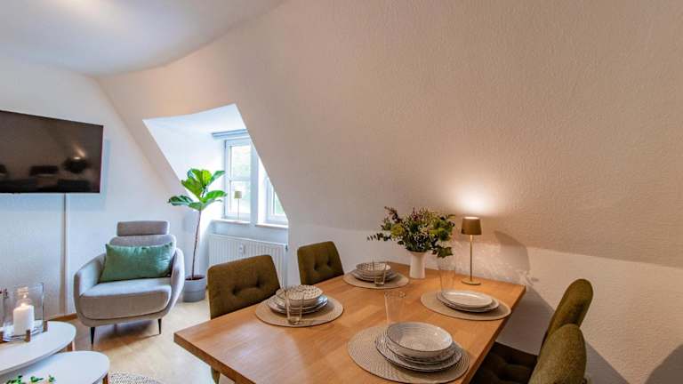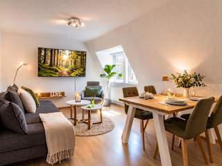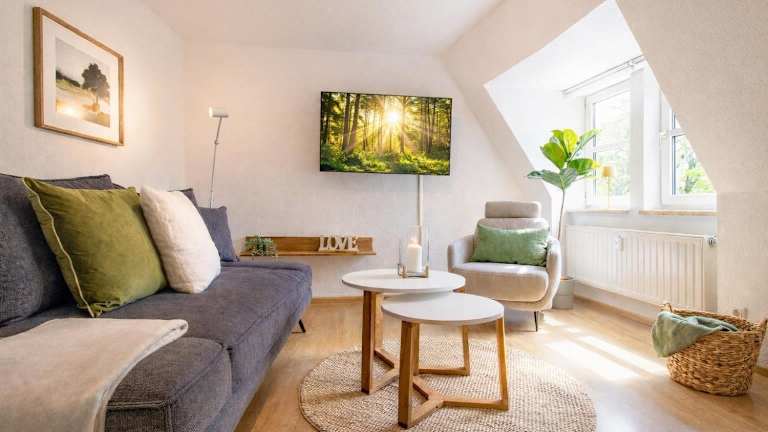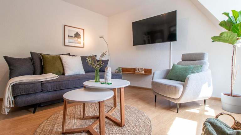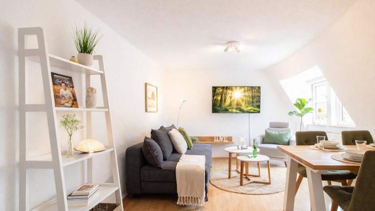 Die Ferienwohnung verfügt über ein Schlafzimmer, und eine komplett ausgestattete Küche mit Kühlschrank und Geschirrspüler. Ein Flachbild-TV sowie ein Sitzbereich sind ebenfalls vorhanden. Das Badezimmer ist mit einer Badewanne ausgestattet. Handtücher und Bettwäsche werden bereitgestellt.