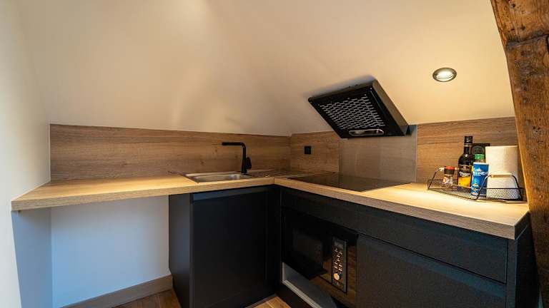 Die Ferienwohnung beinhaltet einen Sitzbereich, ein Badezimmer mit einer Dusche, einem Whirlpool und einer Badewanne sowie eine voll ausgestattete Küche mit Kühlschrank.
