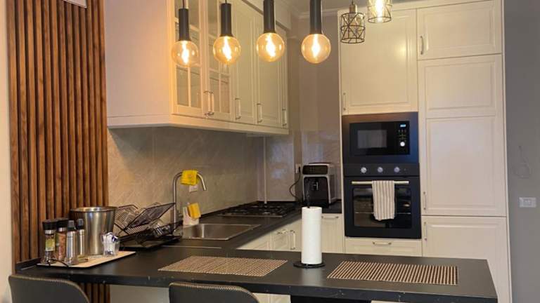 Es werden Möglichkeiten für Essenslieferungen in die Unterkunft angeboten. Die Küche der Ferienwohnung ist voll ausgestattet und enthält einen Kühlschrank sowie eine Kaffeemaschine. Gäste können angeben, dass während ihres Aufenthaltes keine Reinigung der Unterkunft gewünscht ist.