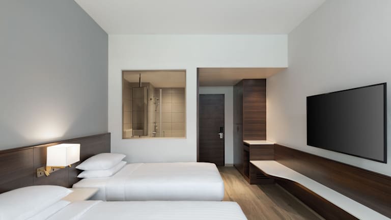 Die klimatisierten Zimmer sind ausgestattet mit einem Schreibtisch, Wasserkocher, Minibar, Safe, Flachbild-TV und eigenem Badezimmer mit Dusche. Bettwäsche und Handtücher sind in jedem Zimmer vorhanden. Rollstuhlgerechte Zimmer sind ebenfalls verfügbar. Die Unterbringung bietet sowohl Familien- als auch Nichtraucherzimmer.