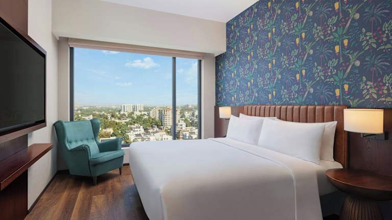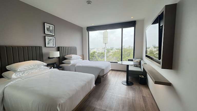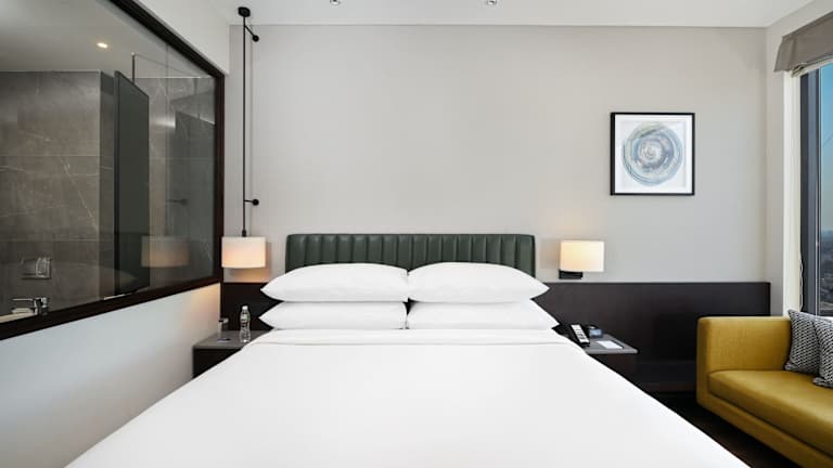Die Zimmer sind klimatisiert und ausgestattet mit einem Sitzbereich, einem Flachbild-TV mit Kabelkanälen, einem Safe sowie einem eigenen Badezimmer mit Dusche, kostenlosen Pflegeprodukten und Haartrockner. Zusätzlich verfügen die Zimmer über einen Wasserkocher und einen Kühlschrank, einige bieten einen Blick auf die Stadt.