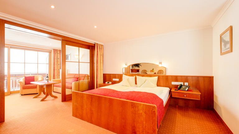 Die Zimmer sind fast alle barrierefrei. Die allermeisten Verfügen über eine große Sitzecke mit Couch und Sesseln, Schreibtisch, Minibar und Balkon. Von den Zimmern zur Südseite genießt man einen wunderbaren Blick auf die Oberstdorfer Bergwelt. Das Hotel stellt für Kinder kostenlos Kinderbetten zur Verfügung. Für Großfamilien gibt es Hochbetten.