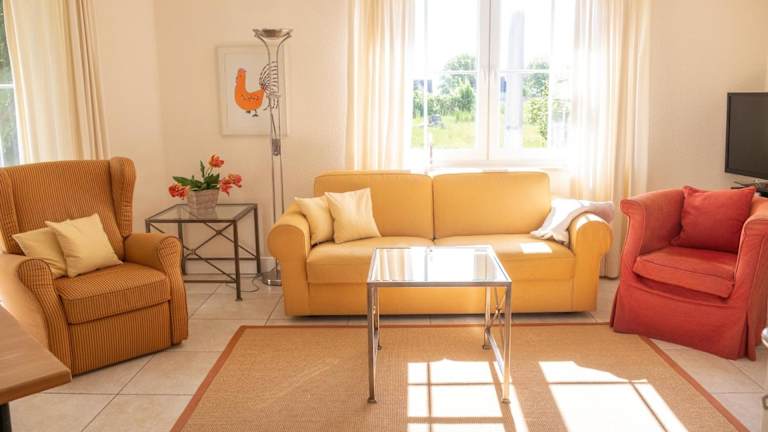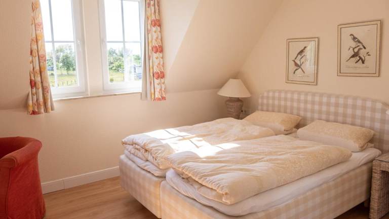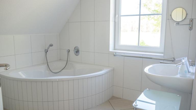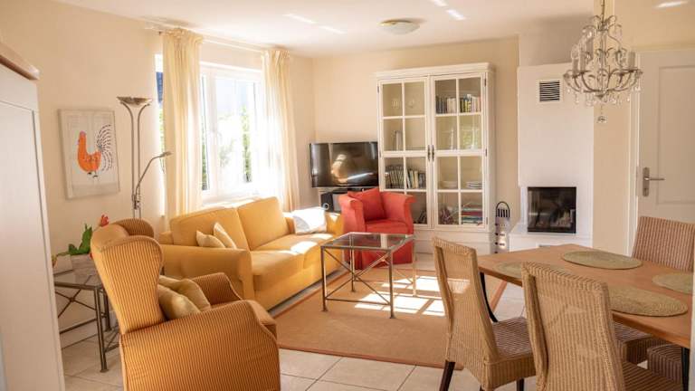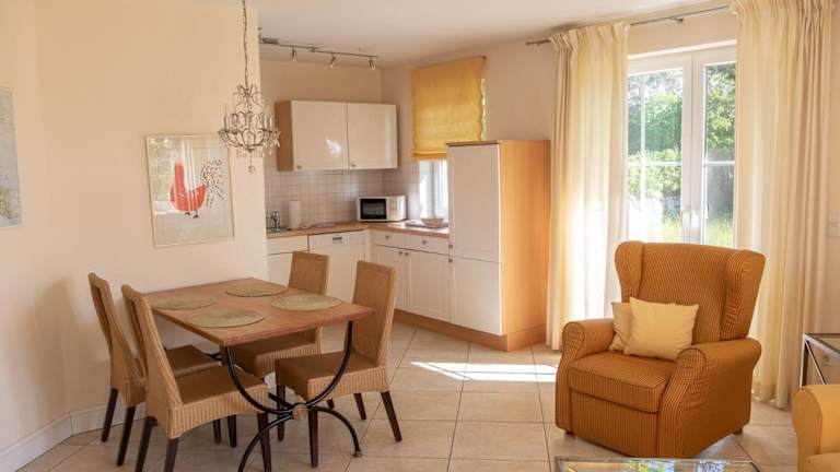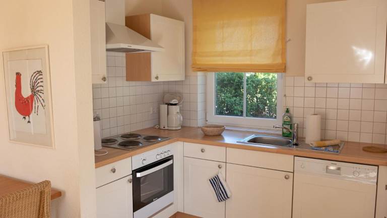 Das Ferienhaus bietet eine Küche, die mit Kühlschrank, Geschirrspüler und Ofen ausgestattet ist. Es umfasst zudem ein Wohnzimmer mit Sitz- und Essbereich, zwei Schlafzimmer sowie ein Badezimmer mit Dusche und Badewanne. Handtücher und Bettwäsche sind ebenfalls vorhanden.