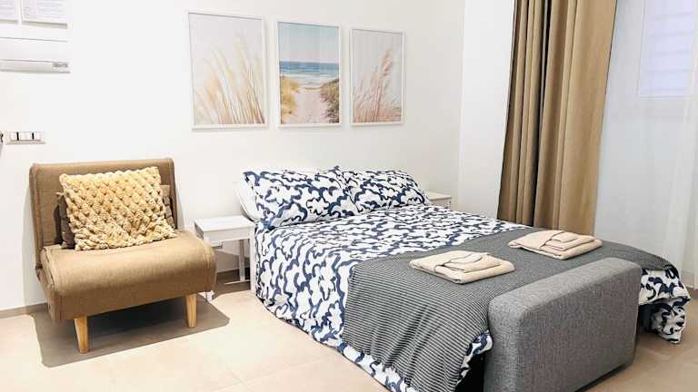 Die Ferienwohnung besteht aus einem Schlafzimmer und einem Wohnzimmer sowie einer voll ausgestatteten Küche, die mit einem Kühlschrank und einer Kaffeemaschine ausgestattet ist. Das Badezimmer ist mit einem Bidet und einer Dusche versehen. Zur Ausstattung gehören außerdem Klimaanlage, Handtücher, Bettwäsche und eine Vielzahl von Annehmlichkeiten, die den Gästen während ihres Aufenthalts zur Verfügung stehen.