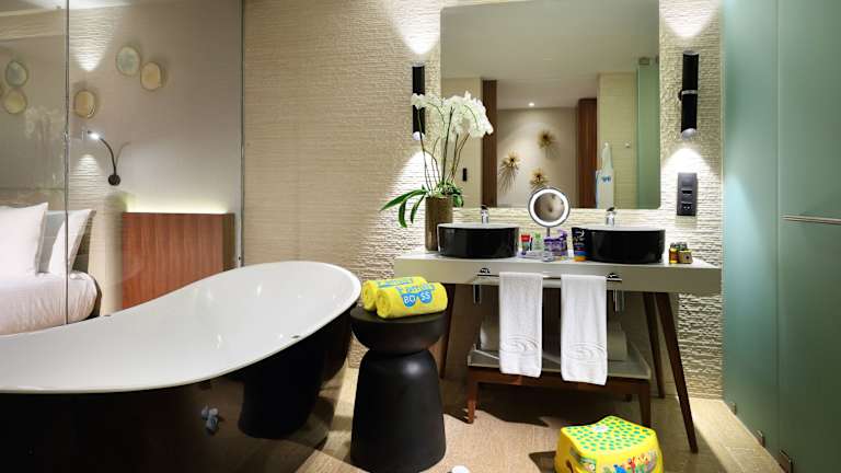 Die Zimmer sind klimatisiert und bieten einen Blick auf den Garten, ausgestattet mit einem Schreibtisch, einer Kaffeemaschine, einer Minibar und einem Safe. Weitere Ausstattungsmerkmale sind ein Flachbild-TV, ein Balkon sowie ein eigenes Badezimmer mit Dusche. Die Gäste finden in ihren Zimmern Bettwäsche, Handtücher und Hausschuhe vor. Barrierefreie Badezimmer sind auf Anfrage verfügbar.