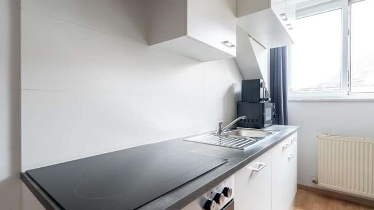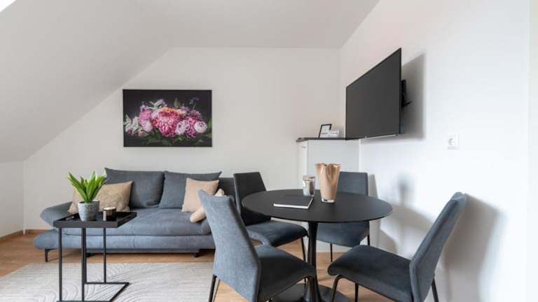 Die Ferienwohnung verfügt über ein Schlafzimmer, eine Küche mit Kühlschrank und Geschirrspüler, einen Flachbild-TV, einen Sitzbereich sowie ein Badezimmer mit Dusche. Handtücher und Bettwäsche werden bereitgestellt.