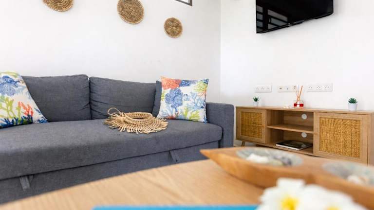 Die Ferienwohnung ist klimatisiert und umfasst zwei Schlafzimmer, ein Wohnzimmer sowie eine voll ausgestattete Küche mit Kühlschrank und Kaffeemaschine. Ein Badezimmer mit Dusche und kostenlosen Pflegeprodukten ist ebenfalls vorhanden. Handtücher und Bettwäsche werden zur Verfügung gestellt.