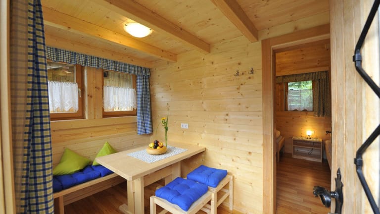 Adventure Hütten aus Holz in Zeltform für 2 - 4 Personen mit Ablage oder Mehrbettlager für 4-5 Personen mit Matratzen Polster und Decken. Die Sanitärbereiche (Damen und Herren getrennt) sind nebenan im Campgelände.