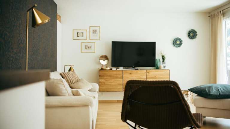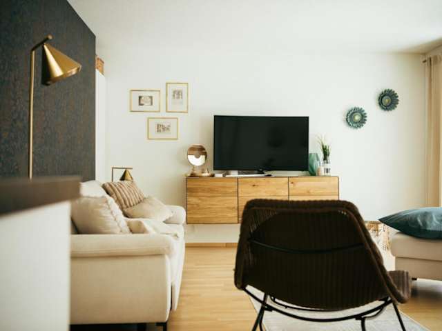 Die Ferienwohnung verfügt über ein Schlafzimmer und eine gut ausgestattete Küche mit Kühlschrank und Geschirrspüler. Ein Flachbild-TV, ein Sitzbereich sowie ein Badezimmer mit Dusche sind ebenfalls vorhanden. Handtücher und Bettwäsche werden bereitgestellt.