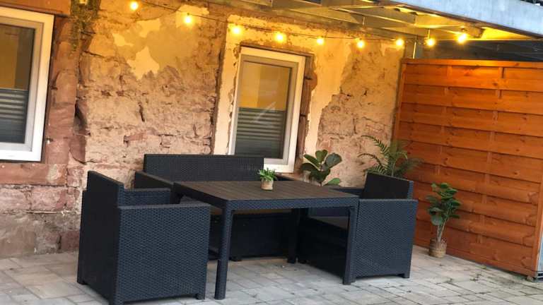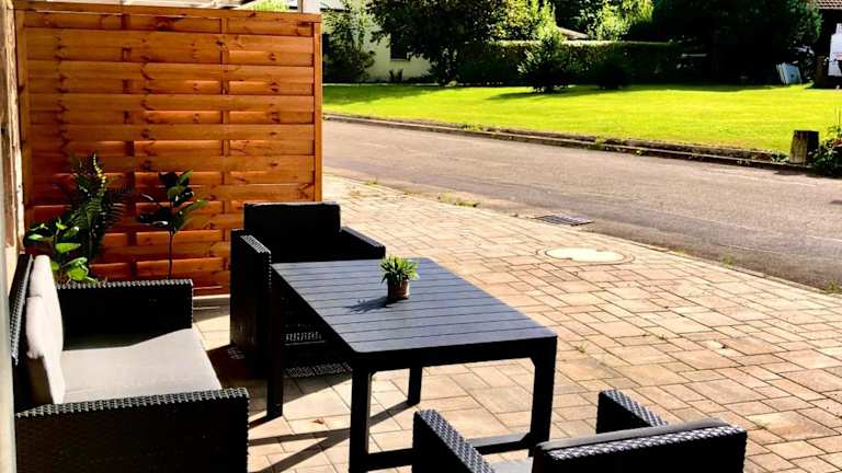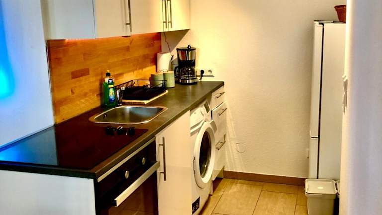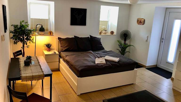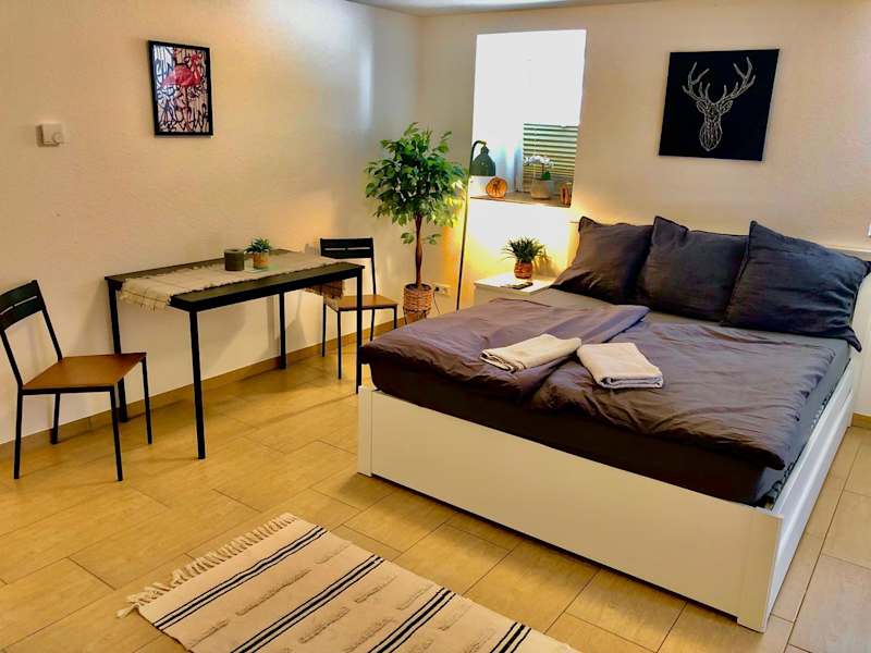 Die Ferienwohnung umfasst ein Schlafzimmer und eine Küche, ausgestattet mit Kühlschrank und Ofen. Zu den weiteren Annehmlichkeiten zählen ein Flachbild-TV, ein Sitzbereich und ein Badezimmer mit Dusche. Handtücher und Bettwäsche werden bereitgestellt. Gartenmöbel stehen ebenfalls zur Verfügung.