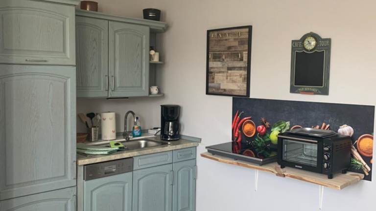 Die Ferienwohnung bietet eine gut ausgestattete Küchenzeile mit einer Minibar, die zur Selbstversorgung einlädt. Zudem sind Grillmöglichkeiten vorhanden.