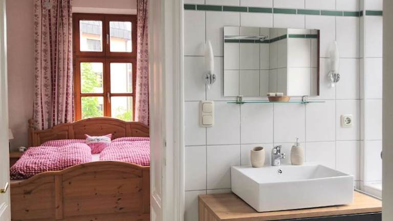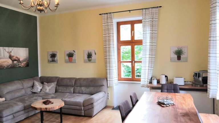 Das Apartment im Ferienappartment zum grünen Hirsch ist geräumig und bietet Platz für bis zu 4 Personen. Es verfügt über 2 komfortable Schlafzimmer, ein gemütliches Wohnzimmer und eine voll ausgestattete Küche. Die Küche ist mit einem Kühlschrank und einer Kaffeemaschine ausgestattet, so dass Sie Ihre eigenen Mahlzeiten zubereiten können. Das Apartment verfügt auch über 2 Badezimmer mit Dusche und Haartrockner, was für zusätzlichen Komfort sorgt. Kostenloses WLAN ist ebenfalls vorhanden.