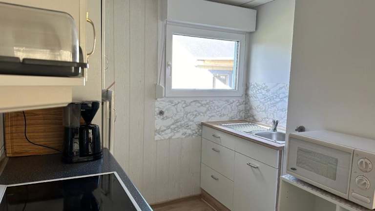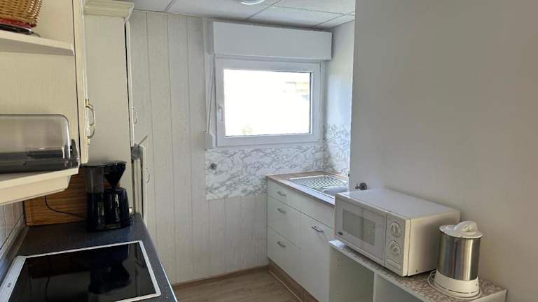 Die Küchenzeile der Unterkunft ist ausgestattet mit einem Kühlschrank, einem Ofen, einer Mikrowelle und einem Wasserkocher, was die Selbstversorgung der Gäste ermöglicht.