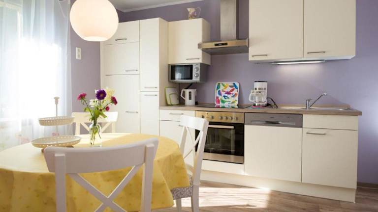 Die Unterkunft ist mit einer Küche ausgestattet, die mit einem Kühlschrank, Geschirrspüler, Ofen, Mikrowelle, Herdplatte, Toaster, Kaffeemaschine und Wasserkocher versehen ist. Dies ermöglicht eine Selbstverpflegung während des Aufenthalts.