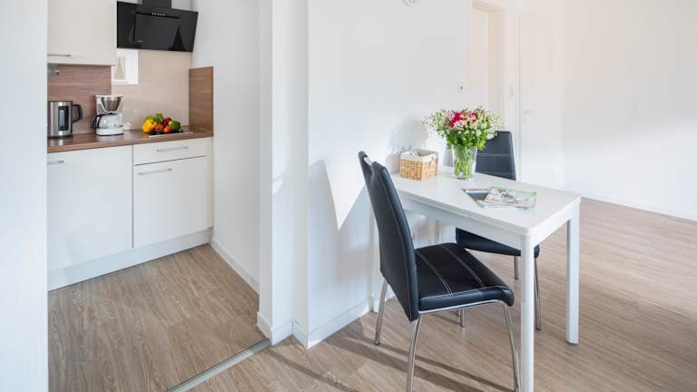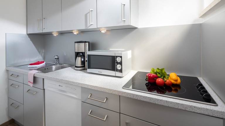 Die Küchenzeile ist mit einem Kühlschrank, Geschirrspüler und einer Mikrowelle ausgestattet. Alle Wohneinheiten verfügen über einen Essbereich, der das Zubereiten und Genießen von Mahlzeiten ermöglicht.