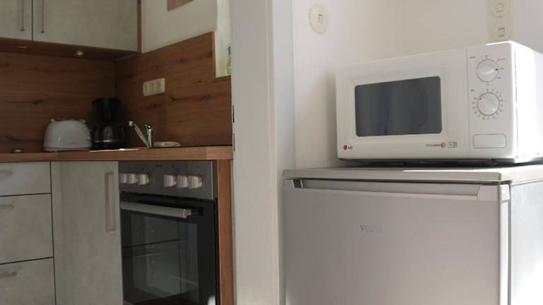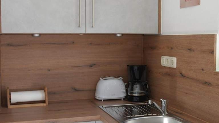 Es liegt eine voll ausgestattete Küche im Ferienhaus vor, die eine Küchenzeile mit Kühlschrank und Kaffeemaschine umfasst. Es sind keine weiteren Verpflegungsmöglichkeiten beschrieben.