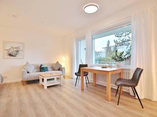 Die Ferienwohnung verfügt über ein Wohnzimmer sowie eine voll ausgestattete Küche, die mit einem Kühlschrank und Geschirrspüler ausgestattet ist. Ein TV ist ebenfalls vorhanden. Bettwäsche und Handtücher sind nicht im Preis enthalten und können gegen Gebühr gemietet werden.