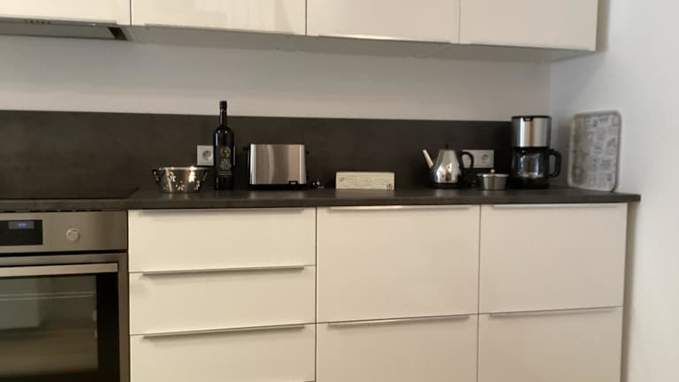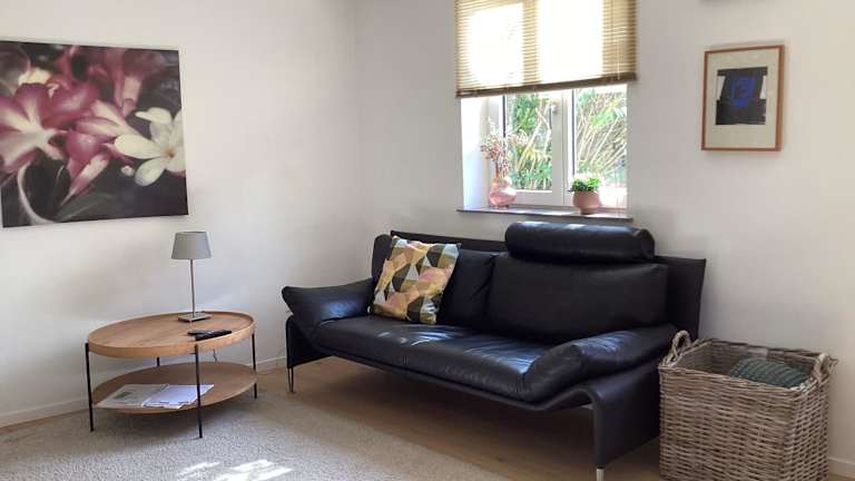 Das Ferienhaus umfasst ein Schlafzimmer, ein Wohnzimmer und eine voll ausgestattete Küche mit Kühlschrank und Kaffeemaschine. Ein Badezimmer mit Dusche und Haartrockner ist ebenfalls vorhanden. Handtücher und Bettwäsche werden bereitgestellt.