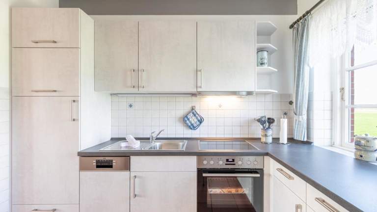 Die Ferienwohnung umfasst eine voll ausgestattete Küche, die mit einem Kühlschrank, einem Geschirrspüler, einer Waschmaschine, einem Ofen und einer Mikrowelle ausgestattet ist, was Selbstverpflegung ermöglicht.