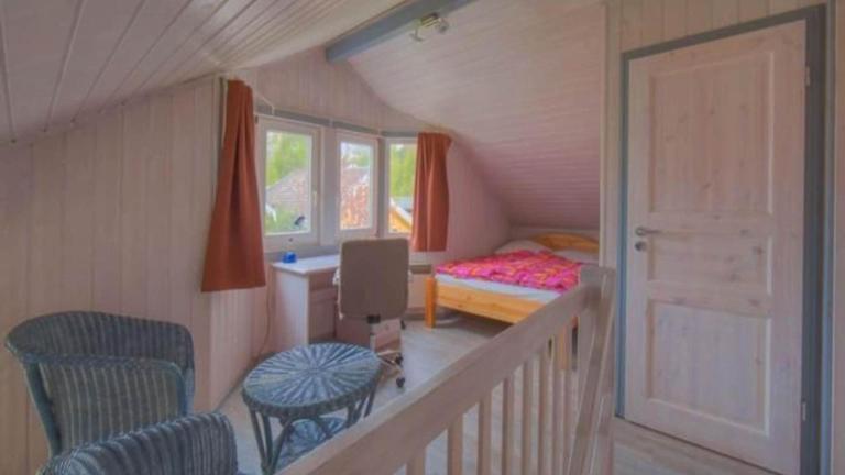 Das Ferienhaus verfügt über zwei Schlafzimmer, ein Wohnzimmer, einen Fernseher sowie eine gut ausgestattete Küche mit Kühlschrank und Ofen. Ein Badezimmer mit Dusche ist ebenfalls vorhanden. Zudem gibt es eine Terrasse mit Seeblick.