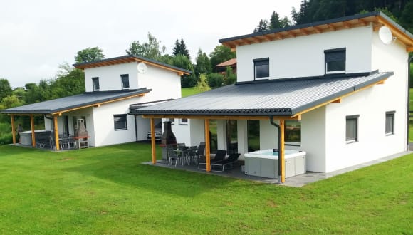 Unsere 2 Ferienhäuser Petzen und Turrach sind spiegelverkehrt, exakt gleich gebaut und ausgestattet. Alles wurde vom Tischler geplant und eingerichtet. Im Erdgeschoss befindet sich der Eingangsbereich mit Garderobe, ein großer offener Wohnbereich mit komplett ausgestatteter Küche, Essbereich und einer Entspannungsecke mit Ledercouch und einem Flatscreen. Ein Schlafzimmer (Doppelbett) und ein Badezimmer / WC finden Sie auch im Erdgeschoss. Der 1. Stock besteht aus einem Schlafzimmer (Doppelbett), einem Badezimmer / WC und einem offenem Zimmer mit Schlafcouch. Ausstattung beider Ferienhäuser: Klimaanlage, großer Wohnbereich mit komplett ausgestatteter Küche, E-Herd, Mikrowelle, Kühlschrank, Geschirrspüler, Toaster, Eierkocher, Kaffeemaschine, Ledercouch, SAT-TV, gratis W-LAN, Holzkohlegrill und Whirlpool auf der Terrasse mit Südblick auf Berg und Tal.