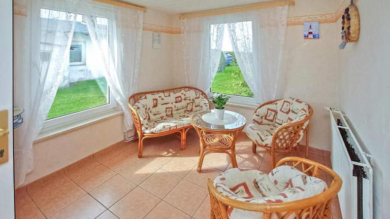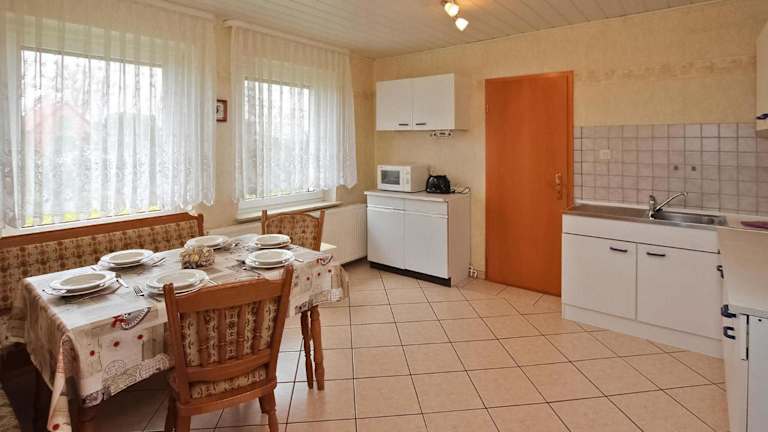 Die Zimmer im Ferienhaus Lüßvitz umfassen drei Schlafzimmer. Zur Ausstattung gehört eine voll eingerichtete Küche mit einem Kühlschrank und einem Ofen.