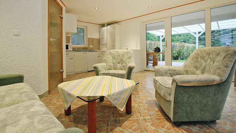 Das Ferienhaus verfügt über ein Schlafzimmer, ein Wohnzimmer, einen Fernseher und eine gut ausgestattete Küche, die mit einem Kühlschrank und einer Mikrowelle versehen ist. Außerdem gibt es ein Badezimmer mit Dusche. Eine Terrasse und Gartenblick ergänzen die Zimmerausstattung.