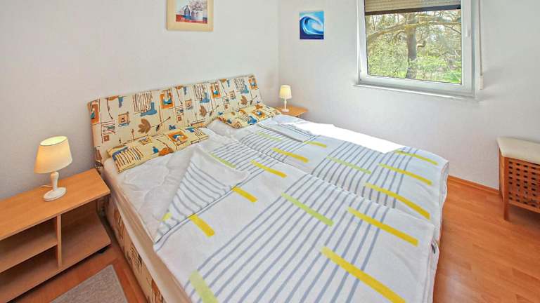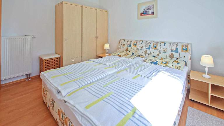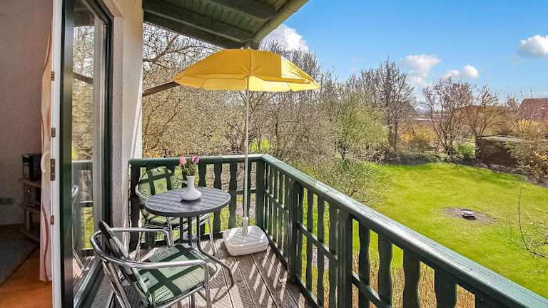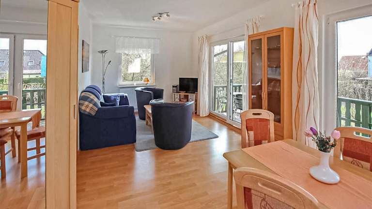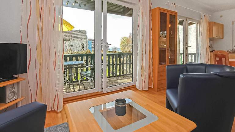 Das Ferienhaus Verchen ist eine Unterkunft mit einem Balkon, einem Schlafzimmer und einem Wohnzimmer. Die Einrichtung umfasst zudem eine gut ausgestattete Küche mit Kühlschrank und Ofen.