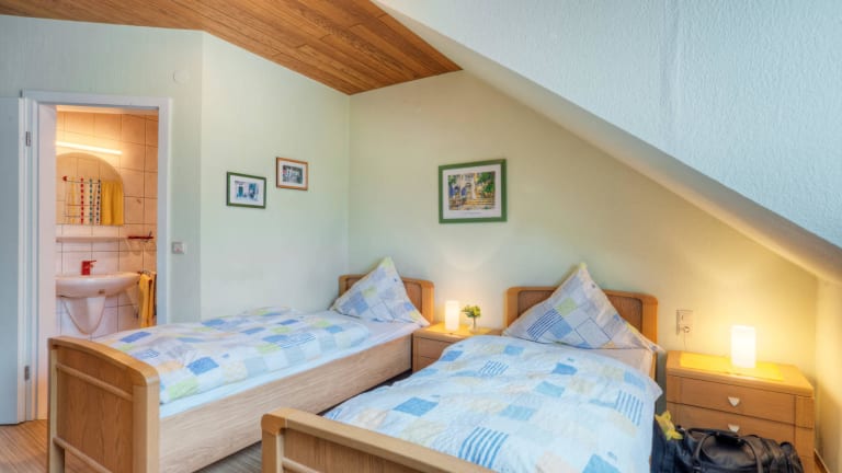 Unseren Gästen bieten wir vier komfortable Gästezimmer (3 Sterne) mit guter Ausstattung: · 9 Betten (inkl. einem 3-Bettzimmer) mit Dusche/WC und Föhn · 4 Zimmer · alle Zimmer mit TV · Aufenthaltsraum · Nichtraucherzimmer · W-LAN im Haus · Kinderfreundlich · Sonnenterrasse · Fahrradunterstellplatz · Frühstücksraum/überwiegend regionale Produkte vom Bauernhof · Hauseigener Parkplatz · 2 Gaststätten mit gutbürgerlicher Küche im Ort