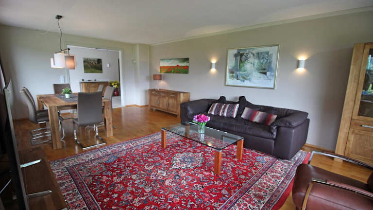 Die Ferienwohnung umfasst 3 Schlafzimmer, ein Badezimmer mit Dusche und Badewanne, ein Wohnzimmer mit Sitz- und Essbereich sowie eine voll ausgestattete Küche mit Kühlschrank, Geschirrspüler und Ofen. Es stehen Handtücher und Bettwäsche zur Verfügung.