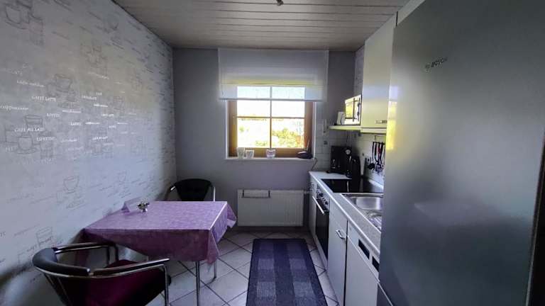 Die Ferienwohnung ist mit einer voll ausgestatteten Küche ausgestattet, die über einen Kühlschrank und eine Kaffeemaschine verfügt. Es liegen Handtücher und Bettwäsche bereit.