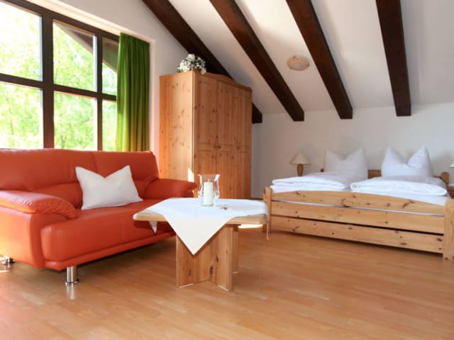 Willkommen im Haus Alpenpanorama! Die Wohnung A8 liegt auf dem Gipfel - im Dachgeschoss Sie biete genug Platz für 2 Personen! Ideal geeignet für Paare oder Einzelreisende. Im Eingangsbereich der Wohnung finden Sie eine kleine Diele wo genug Stauraum für Jacken und Schuhe vorzufinden ist. Der nächste Schritt führt direkt in das helle Wohn- und Schlafzimmer. Durch riesige Fenster ist der Raum hell erleuchtet, was gut zu den dunklen Holzstreben passt, die an der Decke entlang laufen und etwas an ein Fachwerkhaus erinnern. Unter der Dachschräge finden Sie das gemütliche Doppelbett. Außerdem finden Sie einen gemütlichen Esstisch, sowie einen weiteren Sessel und ein Schreibtisch hier vor. Die Küche verfügt ebenfalls über ein Dachfenster und ist mit allem notwendigen ausgestattet. Das Tageslichtbad enthält eine Badewanne mit Duschvorrichtung. Bitte beachten Sie die Dachschrägen in der gesamten Wohnung, dann werden Sie sich hier wohl fühlen! WLAN ist für einen kleinen Aufpreis vorhanden, Baby Bett und Hochstuhl stehen zur Verfügung. Ein Tiefgaragenstellplatz kann dazu gebucht werden. Wir bitten Sie zu beachten, dass es sich um eine Nichtraucherwohnung handelt! Wir freuen uns auf Ihre Anfrage!
