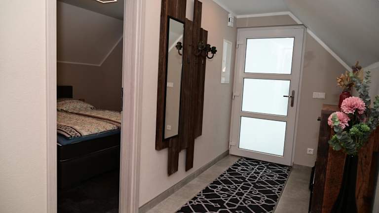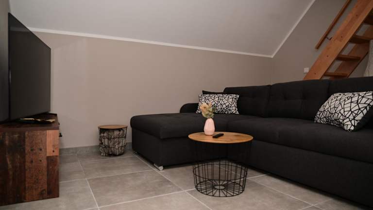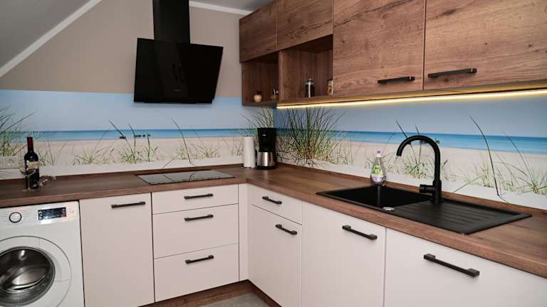 Die Ferienwohnung umfasst eine voll ausgestattete Küche, die mit einem Kühlschrank und einer Kaffeemaschine ausgestattet ist, wodurch die Selbstverpflegung ermöglicht wird.