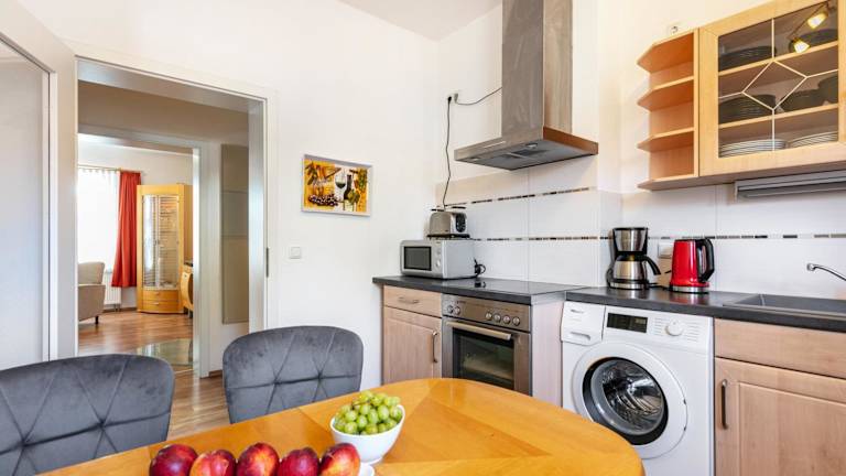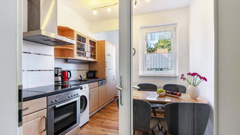 Die voll ausgestattete Küche in der Ferienwohnung umfasst einen Kühlschrank und eine Kaffeemaschine.
