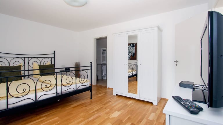 Direkt nach Betreten der Wohnung merkt man, dass es sich um eine sehr helle Wohnung handelt. Der geräumige Eingangsbereich bietet Platz für Jacken und Schuhe und führt direkt in den Rest der Wohnung. Eines der 2 Badezimmer verfügt über eine Waschmaschine mit Münzautomat, wo Sie bequem Ihre Wäsche waschen können. Durch das Fenster ist das Badezimmer sehr hell, es verfügt außerdem über eine Dusche sowie diverse Ablagemöglichkeiten und Kleiderhalter, sowie einer Wäschetruhe. Das zweite Badezimmer ist mit einer Badewanne mit Duschvorƒrichtung ausgestattet, sowie ebenfalls einem WC und Waschbecken. Insgesamt befinden sich in der großzügigen Wohnung 4 Schlafzimmer für insgesamt 8 Personen. Drei der Schlafzimmer verfügen über ein Doppelbett. In dem vierten Schlafzimmer befinden sich zwei Einzelbetten. Ideal für Kinder! Alle Schlafzimmer sind mit getrennten Matratzen ausgestattet, damit auch dem Bettnachbar sein wohlverdienter Schlaf zuteil wird. Ebenfalls sind die Zimmer mit Kommoden oder Kleiderschränken ausgestattet, damit Sie Ihre Kleidung gut unterbringen können. Das Highlight der Wohnung ist das große Wohnzimmer mit der offen gestalteten Küche und dem Essbereich. Neben der großen Couch befinden sich hier noch 2 weitere Sessel (NEU, noch keine Fotos vorhanden) Durch die großen Fenster zur Dachterrasse, ist dieser Raum sehr freundlich und erlaubt bei gutem Wetter einen traumhaften Panoramablick. Auf der 50qm Dachterrasse stehen Möbel zur Nutzung bereit und warten nur darauf von Ihnen benutzt zu werden. Die große Couchlandschaft sorgt für gesellige Abende vor dem Fernseher, aber auch an dem großen Esstisch ist ausreichend Platz für bis zu 8 Personen. Außerdem stehen Ihnen hier Sitzsäcke zum Entspannen, zur Verfügung. Eines der Schlafzimmer befindet sich im hinteren Teil der Wohnung, gemeinsam mit dem direkt daran angeschlossenen Badezimmer mit Badewanne, die anderen drei Schlafzimmer befinden sich im Eingangsbereich/vorderen Teil der Wohnung und teilen sich das Badezimmer mit Dusche. Die zum Wohnraum offen gestaltete Küche verfügt über Spülmaschine, Herd, Mikrowelle, Kaffeemaschine, Wasserkocher und vielen Extras. WLAN kann für 10 Euro pro Woche gekauft werden, ebenfalls 2 Tiefgaragenstellplätze gegen Gebühr! Wir bitten um Verständnis, dass Tiere hier nicht erlaubt sind. Es handelt sich um eine Nichtraucherwohnung. Ein separates Gäste-WC ist ebenfalls vorhanden!
