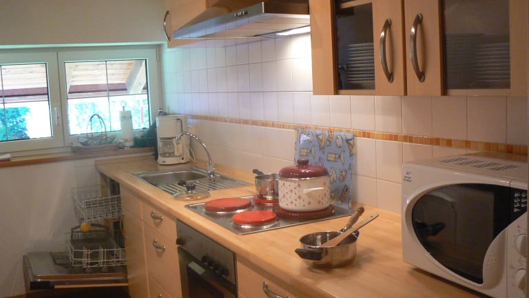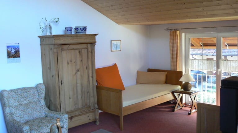 Größere Urlaubswohnung: Ein geräumiges und über 4m hohes Wohnzimmer lädt Sie zum Verweilen ein. Sie können durch die beiden zusätzlichen Giebelfenster in den Himmel schauen und durch die 4 bodentiefen Panoramafenster ist es sehr hell. Ein 1, 40 m breites Sofa ist über Nacht mit einem Handgriff zur gemütlichen und komfortablen Schlafstätte ausklappbar. (Dank der Kombination aus Kaltschaumauflage und Federholzleisten garantieren sie einen luxuriösen und zusätzlichen Schlafplatz). Der Balkon ist vom Wohnzimmer aus zugänglich und mit den Doppeltüren wird auch der Wohnraum zum Balkon. Er bietet Sonne und Ausblick Richtung Westen auf die Hörnerkette. Der Wohnraum ist zum Giebel hin offen gestaltet und am großen Esstisch können auch vier Personen bequem sitzen und Ihre Mahlzeiten genießen. Das große, separate Schlafzimmer mit Vorhang- Himmel lässt Sie zur Ruhe kommen und beim Blick aus den beiden Fenstern können Sie den Alltag vergessen. Sie sehen die Hintersteiner Berge und den Iseler. Ihre Küche ist komplett ausgestattet mit 4-Platten Herd, Backofen, Mikrowelle und Spülmaschine. Alles was Sie so brauchen ist vorhanden. Das geräumige Badezimmer mit sonnengewärmten Wasser aus der hauseigenen Solaranlage gibt Ihnen schon morgens unter der Dusche Esprit für den ganzen Tag.