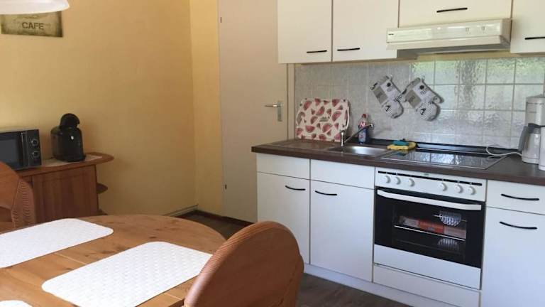 Die Ferienwohnung verfügt über eine voll ausgestattete Küche mit Kühlschrank und Kaffeemaschine, in der Selbstverpflegung möglich ist.