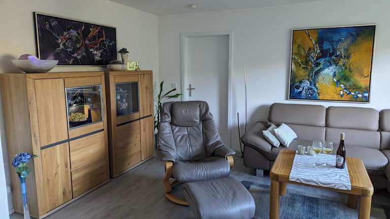 Die Ferienwohnung verfügt über eine voll ausgestattete Küche mit Kühlschrank, Geschirrspüler und Ofen, ein Wohnzimmer mit Sitz- und Essbereich, ein Schlafzimmer sowie ein Badezimmer mit Dusche und Badewanne. Handtücher und Bettwäsche werden bereitgestellt.