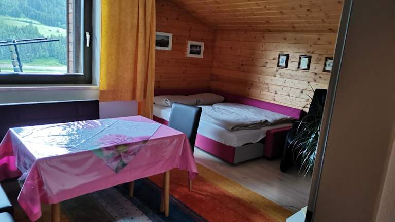 Die Ferienwohnung umfasst ein Schlafzimmer, ein Wohnzimmer, eine gut ausgestattete Küche, ein Badezimmer mit Dusche und Badewanne sowie einen Balkon mit Bergblick. Zur Ausstattung gehören zudem ein Satelliten-Flachbild-TV sowie Handtücher und Bettwäsche.