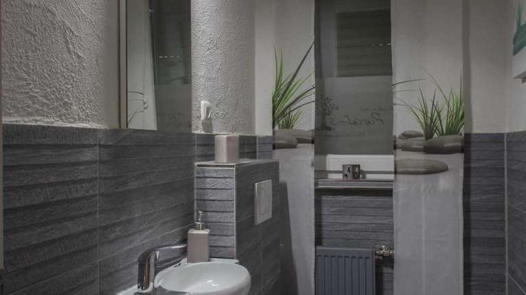 Die Ferienwohnung umfasst zwei Schlafzimmer und zwei Badezimmer, die mit einer Dusche sowie einer Badewanne ausgestattet sind. Des Weiteren sind ein Wohnzimmer mit einem Sitzbereich und ein Essbereich vorhanden. Handtücher und Bettwäsche werden bereitgestellt.