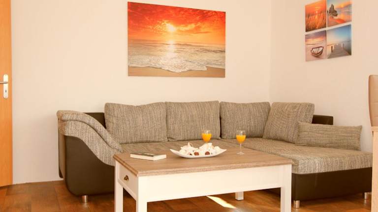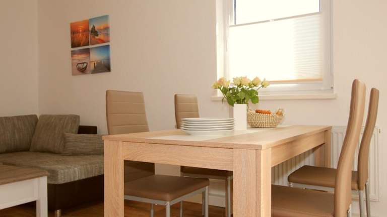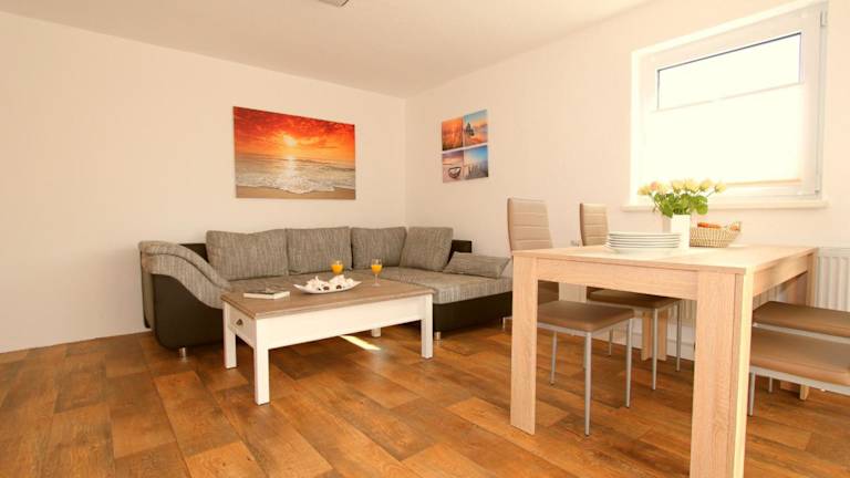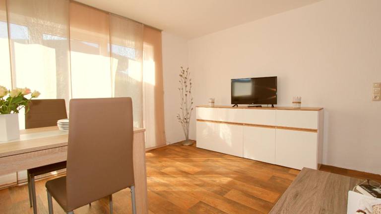Die Ferienwohnung umfasst zwei Schlafzimmer, ein Wohnzimmer sowie eine gut ausgestattete Küche mit Kühlschrank und Geschirrspüler. Handtücher und Bettwäsche sind ebenfalls vorhanden, ebenso wie eine Heizung. Die gesamte Unterkunft ist rauchfrei, sowohl in den privaten als auch in den öffentlichen Bereichen.