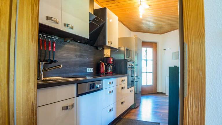 Die Unterkunft verfügt über eine gut ausgestattete Küche mit Kühlschrank und Geschirrspüler, in der die Gäste ihre eigenen Mahlzeiten zubereiten können. Grillmöglichkeiten stehen ebenfalls im Garten zur Verfügung.
